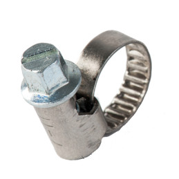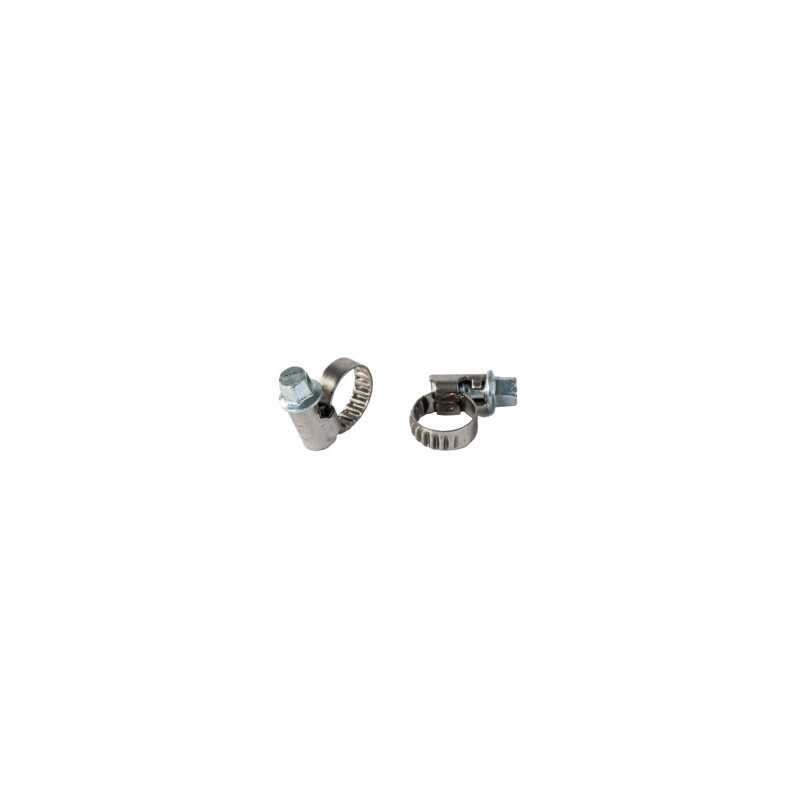 W2: Fita e carter em aço AISI 430; parafuso transversal zincado-chave de boca 7. Fita roscada prensada e elevada, com bordas arredondadas. Carter em aço AISI 430 com parafuso transversal zincado. Tamanho compatível com chave de boca 7.